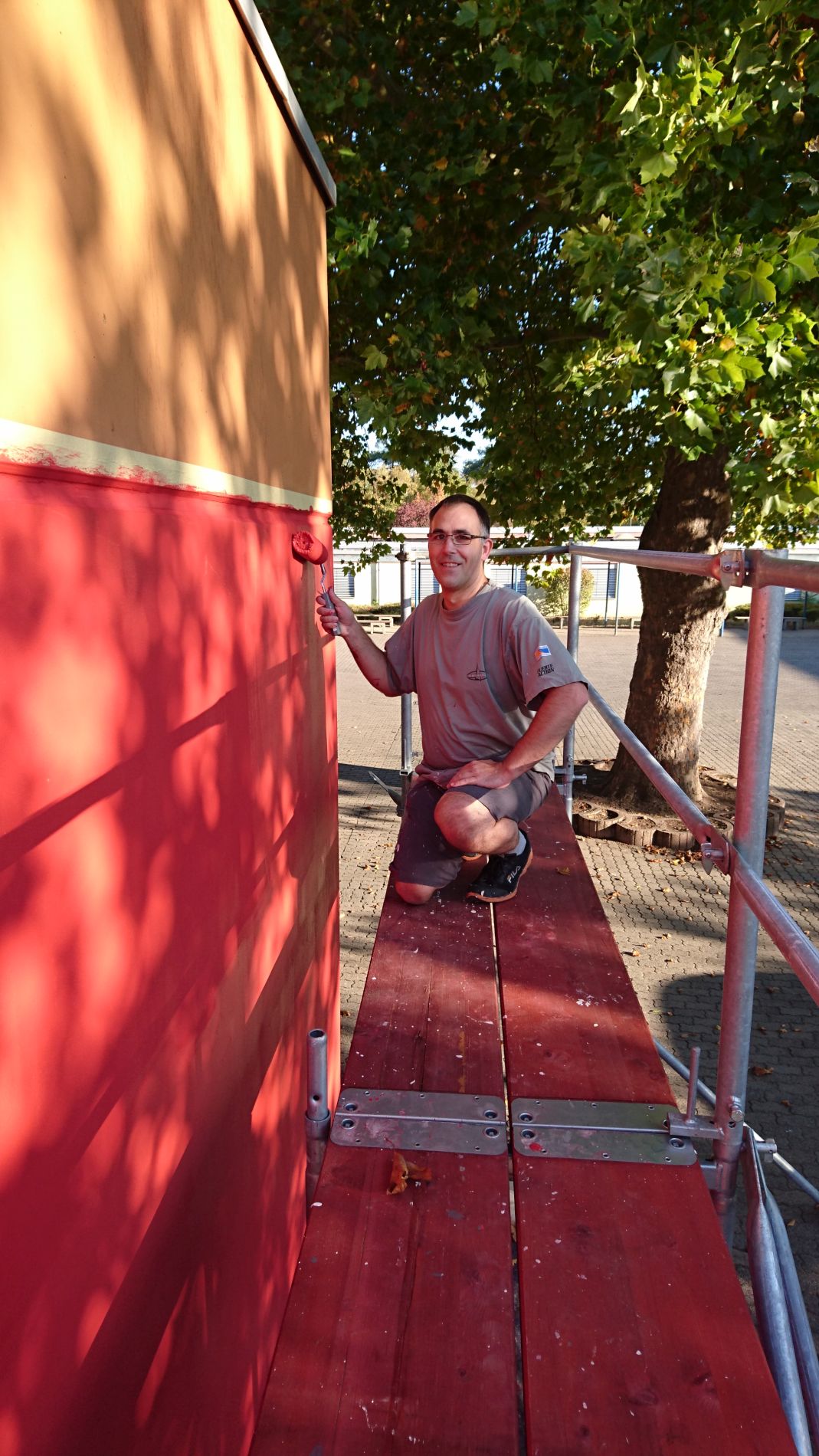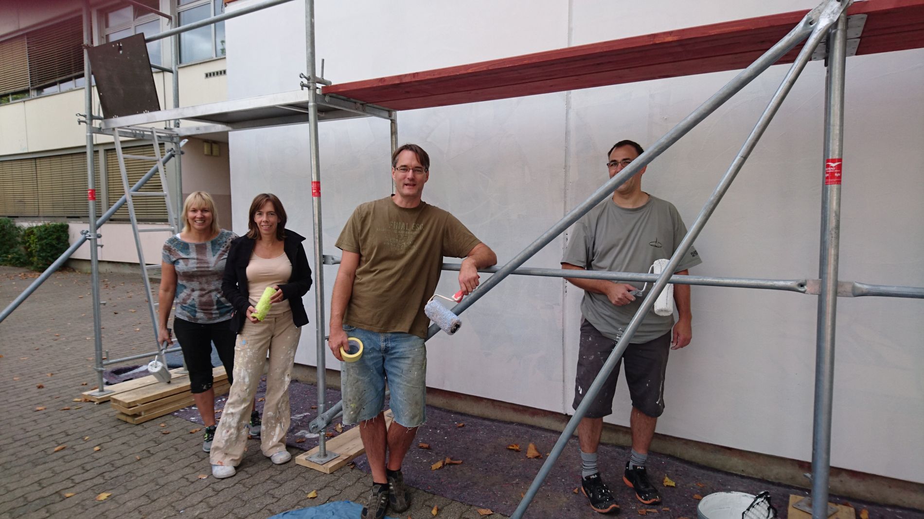 Von der Fachschaft Kunst lieferte Frau Herud den Entwurf für die neue Fassade. Nach Freigabe durch die Schulleitung konnten die Arbeiten beginnen. Eine kurze Rundmail genügte, um zahlreiche fleißige Helfer zu finden. Arndt Dittrich, ehemaliges Mitglied des Schulelternbeirats, ging auf Materialsammlung und konnte schließlich den TOOM Baumarkt Pfungstadt überreden, das gesamte Material für die Arbeiten zu spenden. David Heiner und seine Kollegen vom Hausmeisterteam bereiteten die Fassade vor. Stefan Bauer vom Elternbeirat übernahm die praktische Projektleitung. Tatkräftige Unterstützung erhielt er von Silvia Neureuther, Sabine Kümpel und Holger Rohlfs.