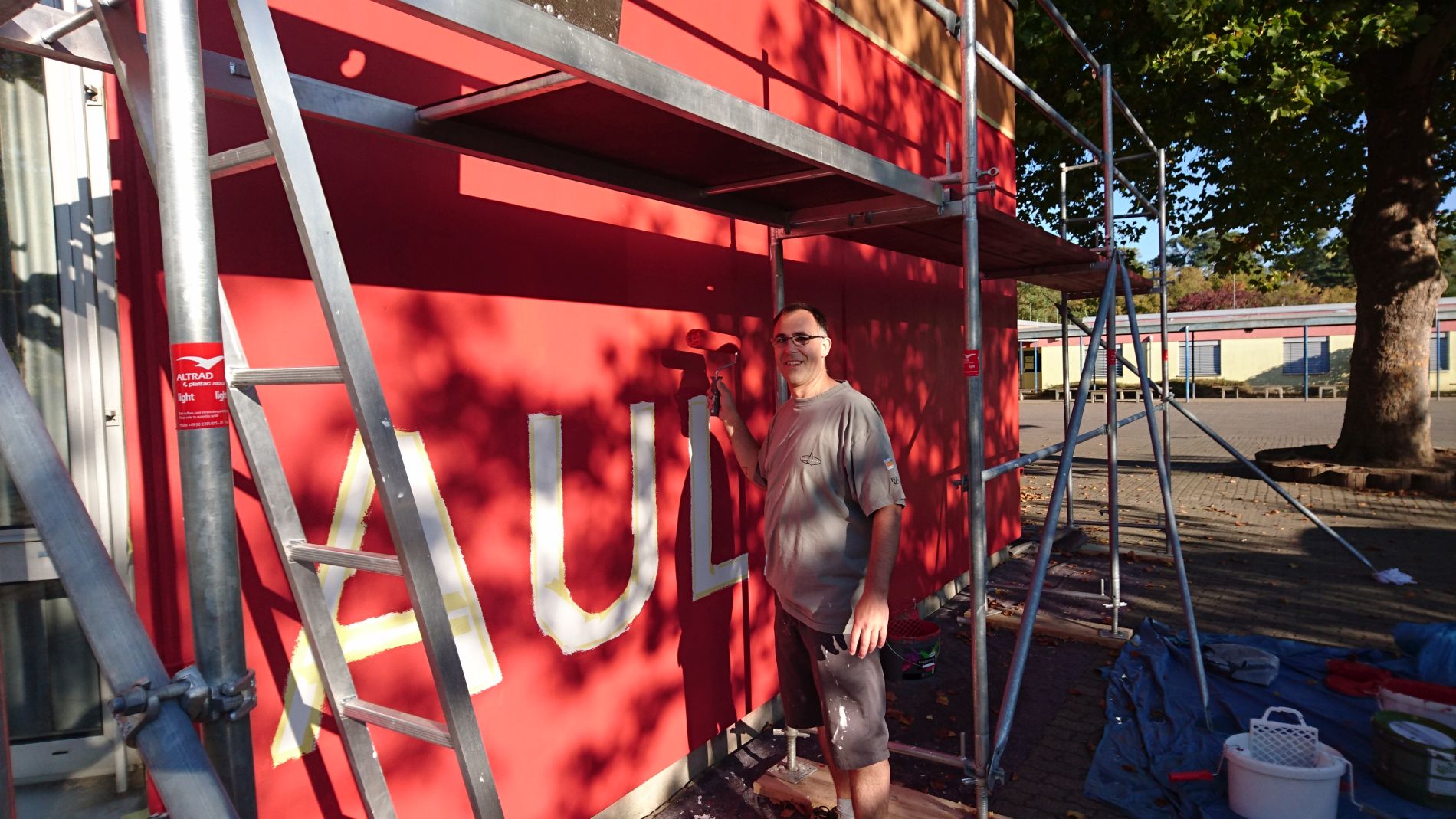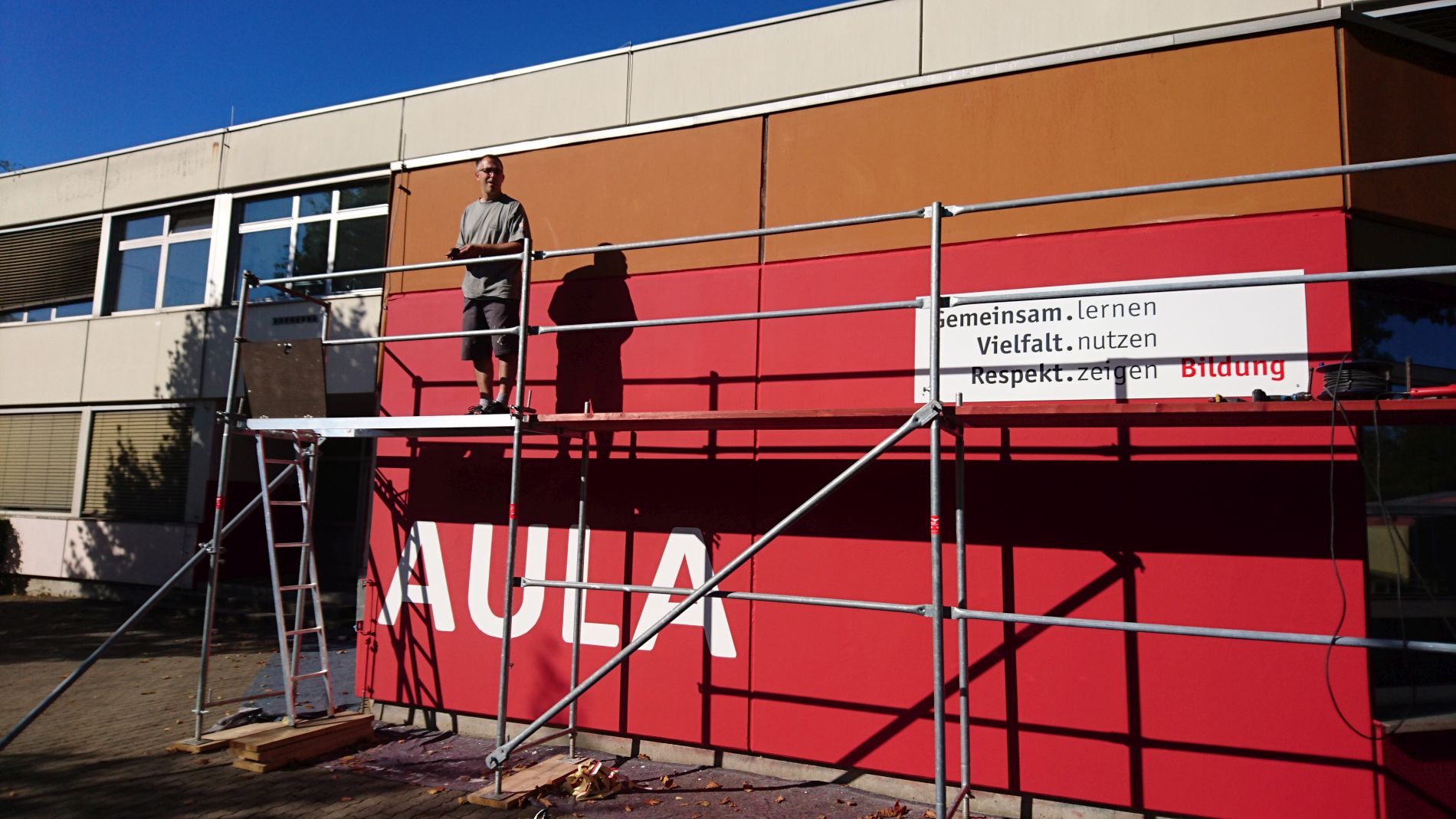 „Unsere GHS soll schöner werden.“ Dieser Gedanke stand am Anfang des Projektes. Da der Schulträger mit notwendigen Modernisierungsmaßnahmen an den über 80 Schulen des Landkreises nicht hinterherkommt, beschlossen die Eltern vom Schulelternbeirat kurzerhand, selber mit anzupacken. Aus dem Elternbeirat heraus gründete sich so die „Arbeitsgruppe GHS gestalten“. Ihr Ziel ist es, die GHS in kleinen Schritten zu verschönern und zu verbessern. Das erste Projekt war schnell gefunden: Die Fassade unserer Aula brauchte dringend einen neuen Anstrich.