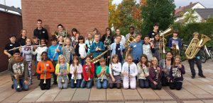 Der neue Bläserjahrgang stellt sich vor: Die Bläserklasse und die Bläser-AG an der Gerhart-Hauptmann-Schule. In diesem Schuljahr haben sich 24 motivierte Schülerinnen und Schüler der Klasse G5c, und dazu die Bläserkinder der Förderstufenklassen und die neu motivierten SuS der Bläser-AG zusammen mit Ihren Teamern ( Lucie, Tadjana, Tobias, Ibrahim, Marcel, Valerie – alle SuS der Bigband und der Oberstufe und Kai aus der 6c) kurz vor den Herbstferien in der Melanchthongemeinde zum Erlernen der ersten Töne und dem professionellen Umgang mit dem Instrument getroffen und gleich richtig losgelegt. Mit den eigenen Profimusikern war das ein gelungener Start und die externen Profis warten schon, um nach den Ferien den grundlegenden Feinschliff geben zu können.