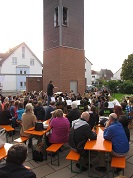 Der Wettergott hatte ein Einsehen und belohnte die mutige Entscheidung der GHS-Organisatoren Sabine Köbler, Ursula Tilsner und Tobias Jurassin für die Open-Air-Variante des Konzertabends: hatte es während der Generalprobe noch wie aus Eimern geschüttet, so blieb es für den Rest des Abends trocken und die Zuhörer genossen die heitere Stimmung der abendlichen Serenade unter freiem Himmel. Die rund 60 jungen Musiker und Musikerinnen saßen direkt unterm Glockenturm, Eltern, Freunde und Verwandte an Tischen und Bänken auf dem Vorplatz der Melanchthongemeinde, es kam fast Biergartenatmosphäre auf.