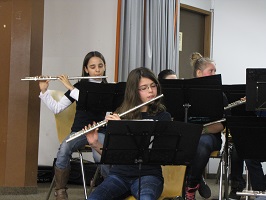 Unter der Leitung von Sabine Meyer-Hermann spielten die Gäste vom Schuldorf in ihrem Soloblock aus der anspruchsvollen Peer-Guynt-Suite ein Arrangement für Bläser „In the Hall of the Mountain King“, anschließend „The Tempest“ und „Final Countdown“. Sabine Meyer-Hermann behielt den Taktstock in der Hand und leitete das gesamte Blasorchester durch die „Farandole“, ein rythmisch anspruchsvoller provenzalischer Volkstanz, die Querflöten hatten ihren Soloauftritt im „Blues for Flutes“ und die Posaunen überzeugten mit einem ziehenden Glissando in „Slip and Slide“.