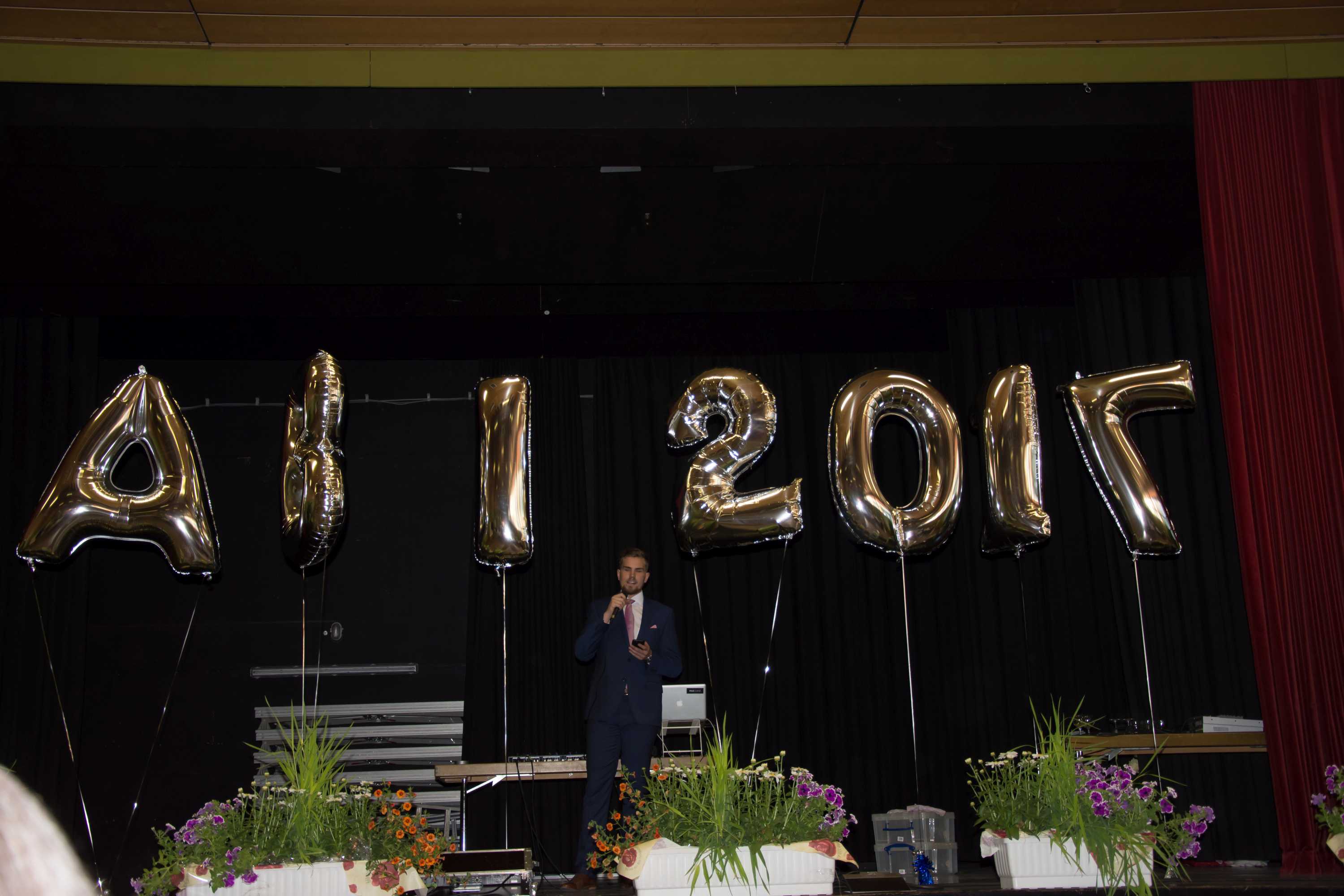 Im Anschluss an die akademische Feier und einen Sektempfang fand der Abi-Ball statt, der von den Schülerinnen und Schülern des Jahngangs organisiert wurde. Oberstufenschülerinnen und -schüler des nächsten Abiturjahrgangs (Q2) haben den Service an den Tischen gestemmt und können sich sicher sein, dass sie 2018 in gleicher Weise Unterstützung finden werden. Trotz schweißtreibender Temperaturen in der Halle feierten die Abiturientinnen und Abiturienten und ihre Gäste ausgelassen bis in den frühen Morgen.