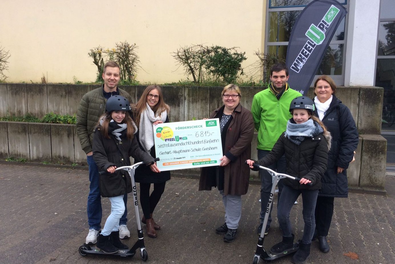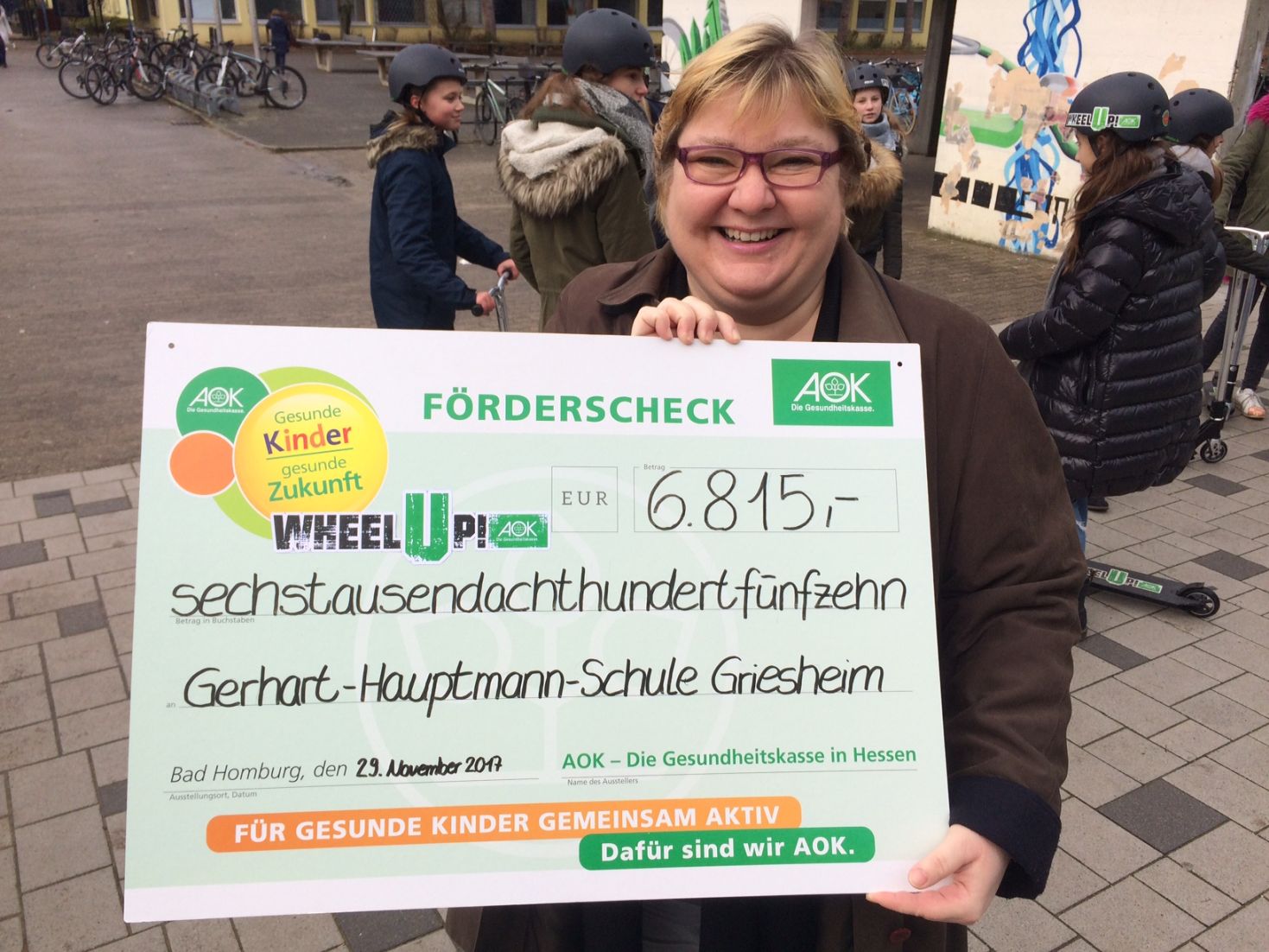 Mit modernen Bewegungsformen will der Fachbereich Sport an der Gerhart-Hauptmann-Schule die Schüler aktivieren und sie zu einer aktiven Freizeitgestaltung anregen. Deshalb wurden 30 Scooter, 30 Waveboards und 15 Helme angeschafft. Unterstützt wurde die Schule von der AOK, die 50 Prozent der Kosten (6815 Euro) übernahm. Die andere Hälfte teilten sich Schule und Förderverein. Wie Juliane Knechtel, die Vorsitzende des Schulelternbereites, bei der Spendenübergabe erläuterte, nimmt die Griesheimer Gesamtschule an dem AOK-Präventionsprogramm „WHEELUP!“ teil. Dieses besteht aus sieben Förderbausteinen und beginnt mit dem WEELUP!-Starter, einer dreistündigen akkreditierten Lehrerfortbildung, die an der GHS vom Schulelternbeirat gesponsert wurde. Danach verblieb der Trailer mit 100 Rollsportgeräten, Schutzausrüstung, Bewegungslandschaften mit Rampen sowie Lernplakaten mit Tipps und Tricks für fünf Tage zum Ausprobieren in der GHS. Durchgeführt wurde das Programm von CITY SKATE, einer Agentur für Funsport- und Bewegungskonzepte, in Kooperation mit der Zentralen Fortbildungseinrichtung für Sportlehrkräfte des Landes Hessen (ZFS). Die Veranstaltungen sind eingebunden in die Teilzertifikate „Bewegung und Wahrnehmung“ sowie „Verkehrserziehung und Mobilitätsbildung“ aus dem HKM-Programm Schule & Gesundheit, erklärten Madeleine Möller von der AOK sowie Steven Moser von der Sportagentur CITY SKATE. Beide wiesen darauf hin, dass Gesundheitsförderung in der Schule spielerisch und kreativ gestaltet werden müsse, damit die Kinder auch darauf anspringen. „WEELUP!“ sei ein gutes Beispiel dafür, wie man Heranwachsende, auch solche, die nicht Mitglied in einem Sportverein sind, für regelmäßige Bewegung regelrecht begeistern kann. „Mit diesem Projekt wollen wir ausnahmslos alle Kinder und Jugendlichen erreichen und sie im wahrsten Sinne des Wortes mobilisieren“, betonte Steven Moser und berichtete, dass die Schüler während der Auftaktveranstaltung vieles ausprobiert haben und beim Rollen über Rampen und Kurven drehen zunehmend sicherer wurden. Von der Möglichkeit mit Unterstützung der AOK Sporttrends in ihr Bewegungskonzept integrieren zu können, zeigten sich Schulsportleiter Chris Thalheimer, die stellvertretende Schulleiterin Birgit Haas und Schulelternbeirats-Vorsitzende Juliane Knechtel gleichermaßen begeistert.