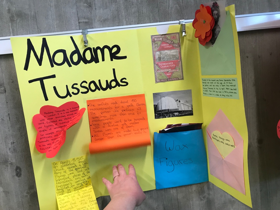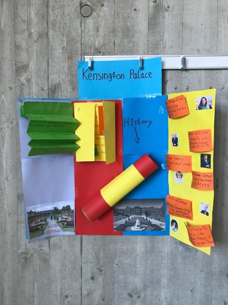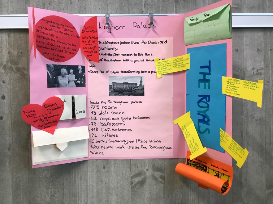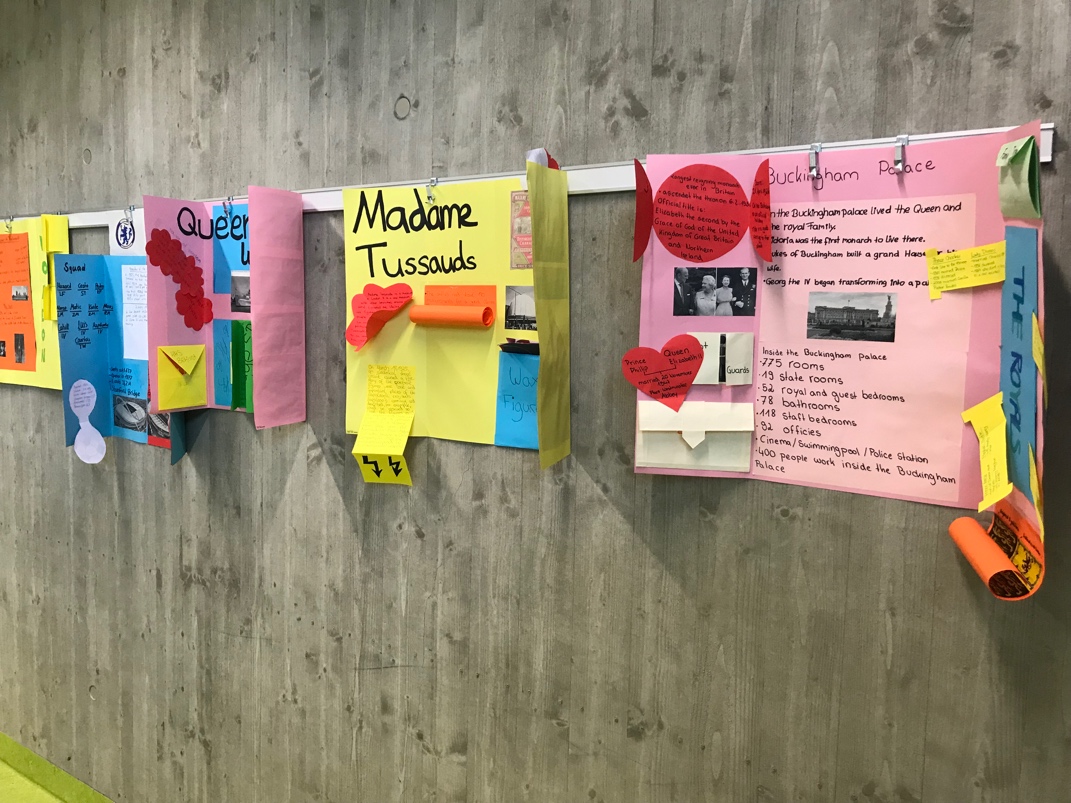 Our project started on Monday. All students from different classes got together and we got to know the project. We had a “Today`s Challenge” checklist including ten different tasks: We learned a lot about the history, famous people, culture, food, London`s sights and we read some famous stories, e.g. Paddington Bear, Jack and the Beanstalk or The Three Little Pigs. On Tuesday we made some pop-up cards. Every student chose a different sight and created a pop-up card. At the end of the day, every single pop-up was stuck on a poster to create a huge map of London. On Wednesday and Thursday we worked on our lapbooks. We worked in groups and chose a topic about England or London we liked best, e.g. the Queen`s Walk or the Buckingham Palace including the Royals. We had lots of fun and time went by very fast. On Friday we presented our lapbooks to the other students. After that it was tea time and we had some tea and made some cucumber sandwiches. Afterwards, we took part in a quiz about England and London. All in all, it was a great week and we learned a lot.
