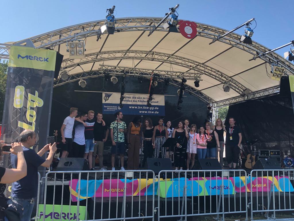 Um 12.30 Uhr ist es dann soweit: Mit „Rolling In The Deep“ eröffnen wir unser Konzert. Es folgt ein Mix aus Rock, Pop und Balladen: „Redemption Song“, „Thinking Out Loud“, „Fuckin‘ Perfekt“. Für Gänsehaut pur sorgen “Killing Me Softly“ und „Heal The World“. Die absoluten Kracher „Always On The Run“ und „TNT“ heizen das Publikum restlos an. Mit der Zugabe „Nobody’s wife“ beenden wir unseren Auftritt und ernten dicken Applaus und ein tolles Feedback.