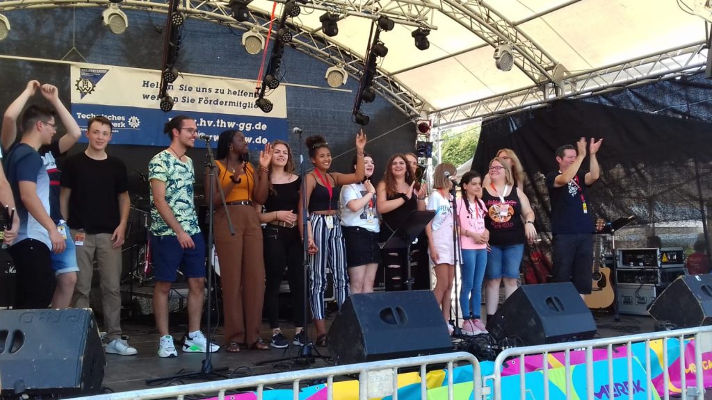 Um 12.30 Uhr ist es dann soweit: Mit „Rolling In The Deep“ eröffnen wir unser Konzert. Es folgt ein Mix aus Rock, Pop und Balladen: „Redemption Song“, „Thinking Out Loud“, „Fuckin‘ Perfekt“. Für Gänsehaut pur sorgen “Killing Me Softly“ und „Heal The World“. Die absoluten Kracher „Always On The Run“ und „TNT“ heizen das Publikum restlos an. Mit der Zugabe „Nobody’s wife“ beenden wir unseren Auftritt und ernten dicken Applaus und ein tolles Feedback.