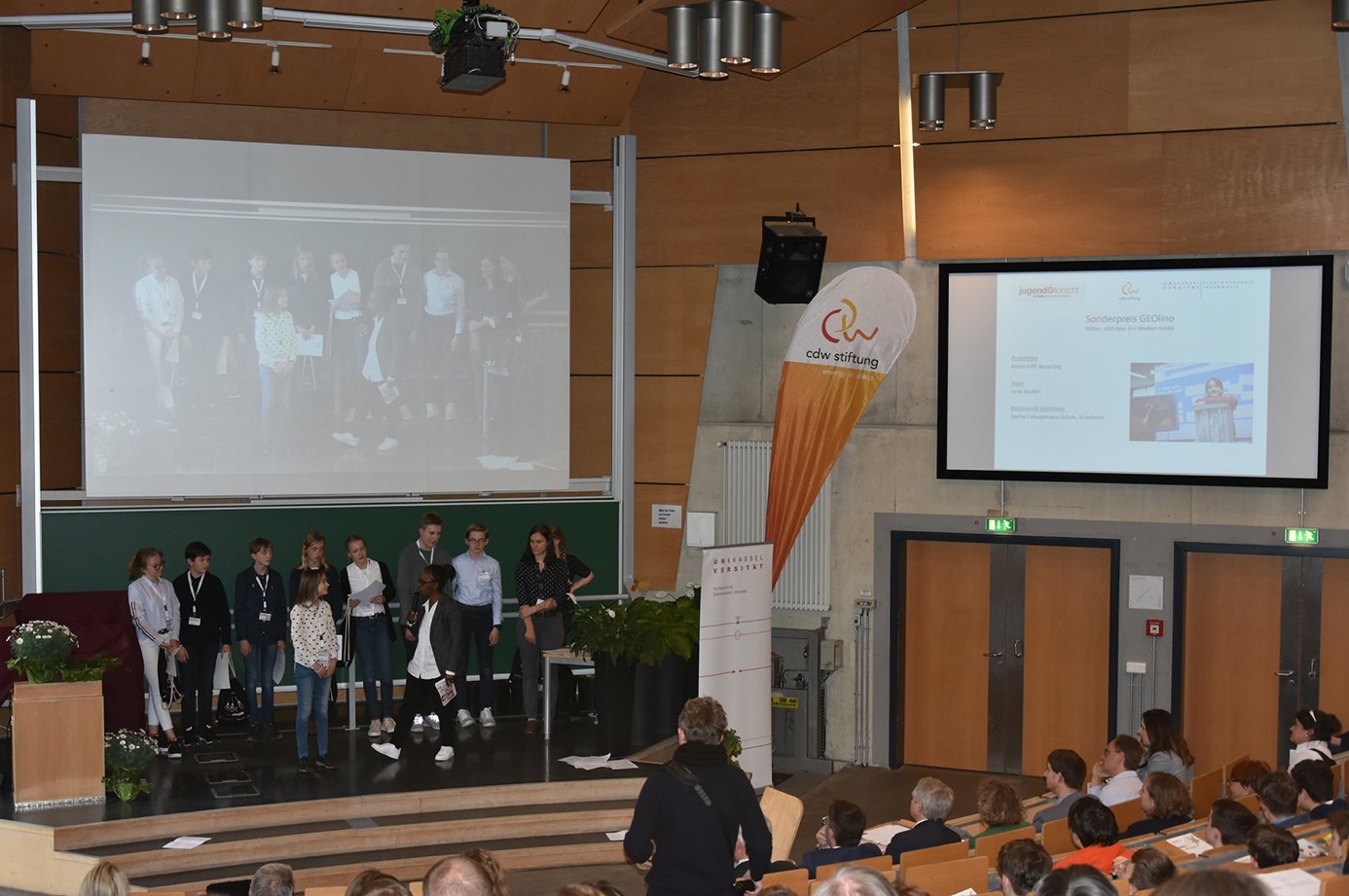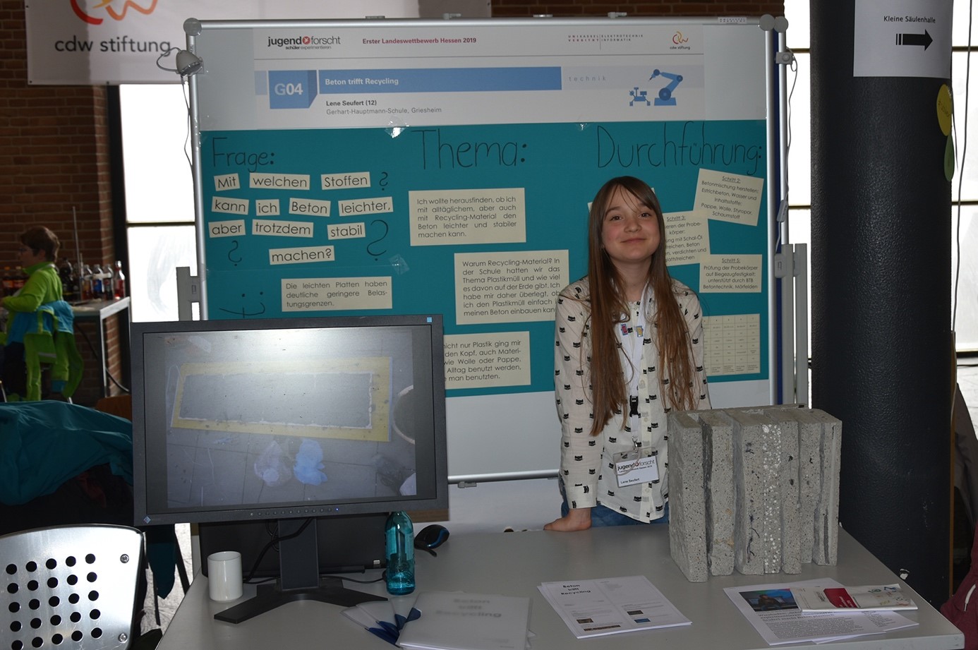 Nach dem Regionalsieg und dem Gewinn des Kalle-Albert-Preises beim Schülerexperimentieren-Wettbewerb in Wiesbaden (Die „Juniorvariante“ von Jugendforscht – wir berichteten bereits) in der Sparte Technik, nahm Lene Seufert mit ihrem Projekt „Beton trifft Recycling“ beim Landeswettbewerb in Kassel teil. Dort gewann sie zwar keinen Gesamtsieg, jedoch den Sonderpreis von GEOlino. Wichtiger jedoch sind die gewonnenen Erfahrungen und neuen Bekanntschaften über den Wettbewerb hinaus. Ein Bericht über den 1. Tag des Wettbewerbs kam in der Hessenschau und ist unter folgenden Link zu erreichen: https://www.hessenschau.de/tv-sendung/hessenschau—ganze-sendung,video-89218.html. In der 23. Minute beginnt der Bericht, Lene ist kurz ab Minute 24:58 zu sehen. Toll gemacht!
