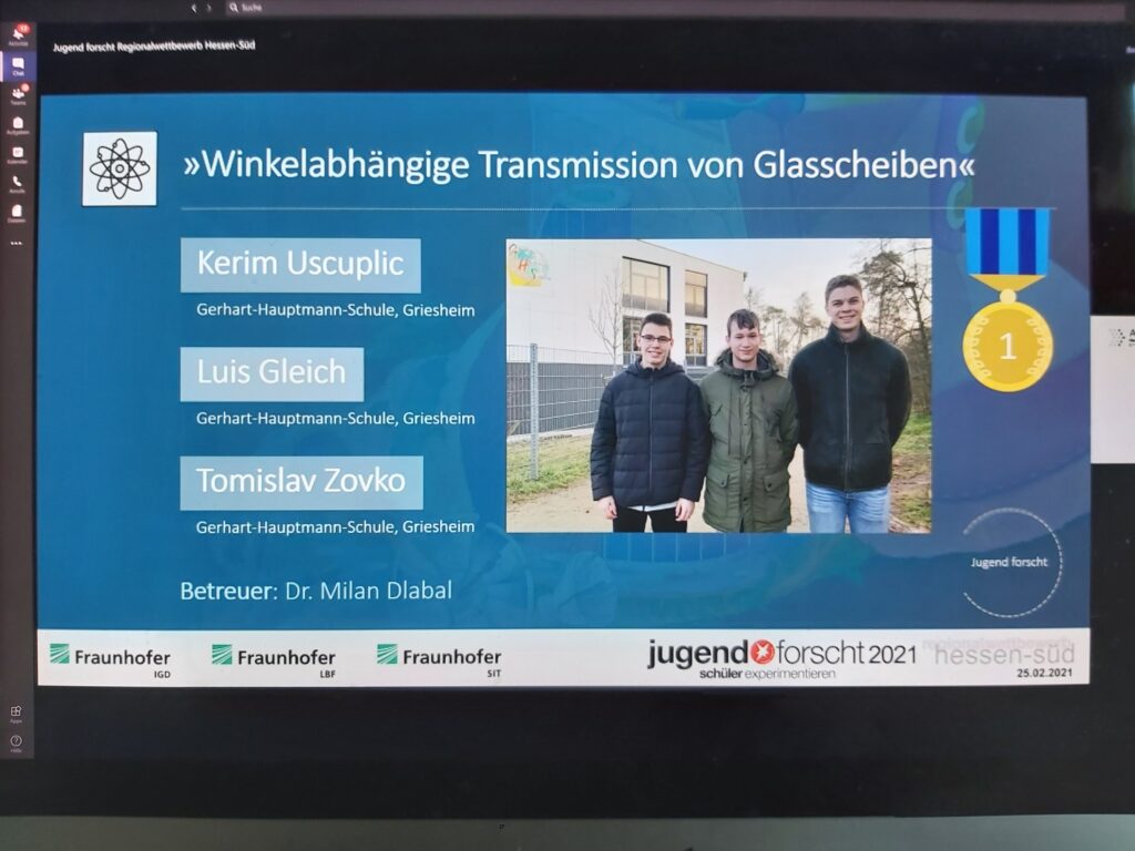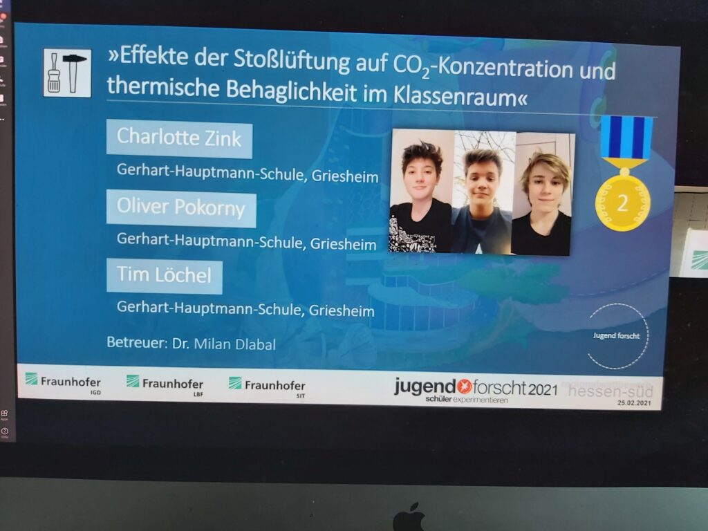 Charlotte Zink, Tim Löchel und Oliver Pokorny (Klasse Ee) haben mit ihrer Arbeit „Effekte der Stoßlüftung auf die CO2-Konzentration und die thermische Behaglichkeit im Klassenraum“ im Fachgebiet Arbeitswelt den zweiten Platz, Luis Gleich, Kerim Uscuplic und Tomi Zovko (Q4) mit ihrer Arbeit „Winkelabhängige Transmission von Glasscheiben“ den ersten Platz in Physik im Regionalwettbewerb von „Jugend Forscht“ unter Leitung von Hr. Dr. Dlabal erreicht.