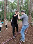 Nachdem die Klassen den ersten Abend der Kennenlernfahrt frei gestalten konnten, startete am Dienstagmorgen die Stationenarbeit der Schulsozialarbeit. Zu absolvieren waren drei Stationen mit jeweils unterschiedlichen Aufgaben und Zielsetzungen. Mittels eines Wasserspiels wurde die Teamfähigkeit einer jeden Klasse unter Beweis gestellt. Auf der Slackline als auch auf einem dicken Tau wurde die Kooperationsfähigkeit der gesamten Klasse gefordert. An der letzten Station war beim Pfad des Vertrauens zunächst das Vertrauen auf die eigenen Fähigkeiten und Sinne gefragt, ehe beim Säuresumpf wieder das Vertrauen in die Klassengemeinschaft bewiesen werden musste.