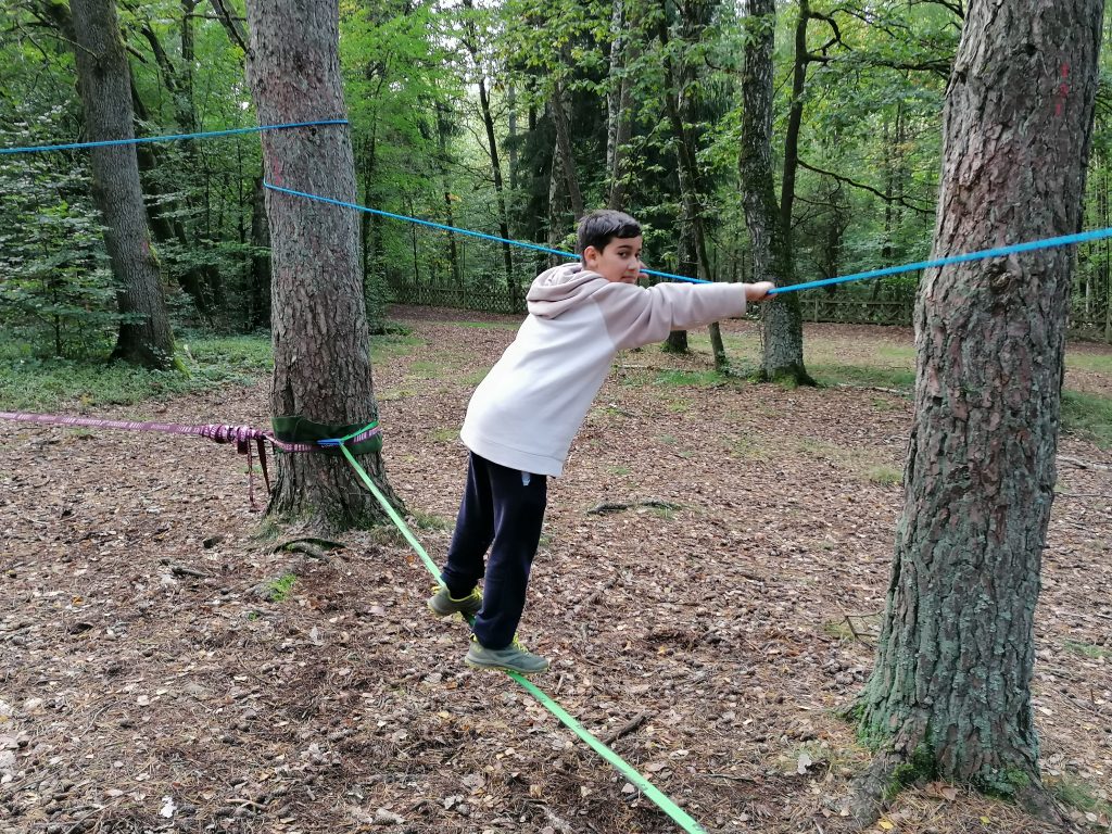Nachdem die Klassen den ersten Abend der Kennenlernfahrt frei gestalten konnten, startete am Dienstagmorgen die Stationenarbeit der Schulsozialarbeit. Zu absolvieren waren drei Stationen mit jeweils unterschiedlichen Aufgaben und Zielsetzungen. Mittels eines Wasserspiels wurde die Teamfähigkeit einer jeden Klasse unter Beweis gestellt. Auf der Slackline als auch auf einem dicken Tau wurde die Kooperationsfähigkeit der gesamten Klasse gefordert. An der letzten Station war beim Pfad des Vertrauens zunächst das Vertrauen auf die eigenen Fähigkeiten und Sinne gefragt, ehe beim Säuresumpf wieder das Vertrauen in die Klassengemeinschaft bewiesen werden musste.