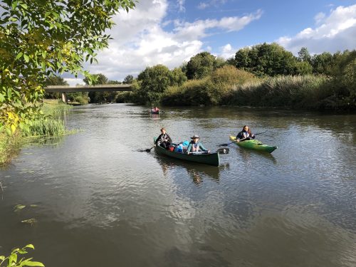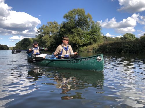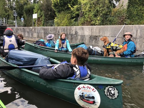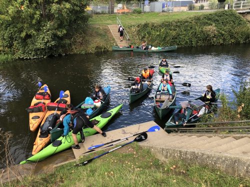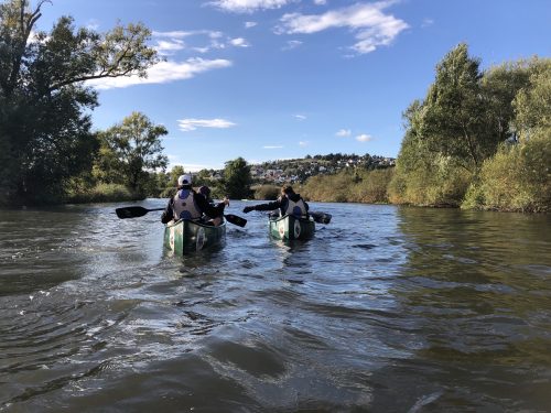 Das ist also die Lahn – unter der Straßenbrücke von Roth schauen 12 Schülerinnen und Schüler mit Ihren Lehrern und dem Schulhund Django auf einen riesigen Haufen Gepäck und sechs große Kanus auf den schmalen Streifen eines Flusses, der sich zwischen umgestürzten Bäumen und Gebüsch hindurch im Grau des wolkenverhangenen Himmels verliert. Aufgedreht durch Adrenalin und Neugier ignorieren wir den Regen, der den ganzen Tag anhält. Nach kurzer Zeit gleiten 6 vollgestopfte Boote im Zickzack und mit gebrüllten Kommandos den Fluss hinab – das Abenteuer hat begonnen! Zu lernen gibt es viel: Gebüsche meiden, geradeaus fahren, auf die Strömung achten und trotz totaler Durchnässung nicht die gute Laune verlieren. Nach 16 km Paddeln erreichen wir den Campingplatz Wißmar, wo die Zelte aufgebaut und die warmen Duschen intensiv getestet werden.