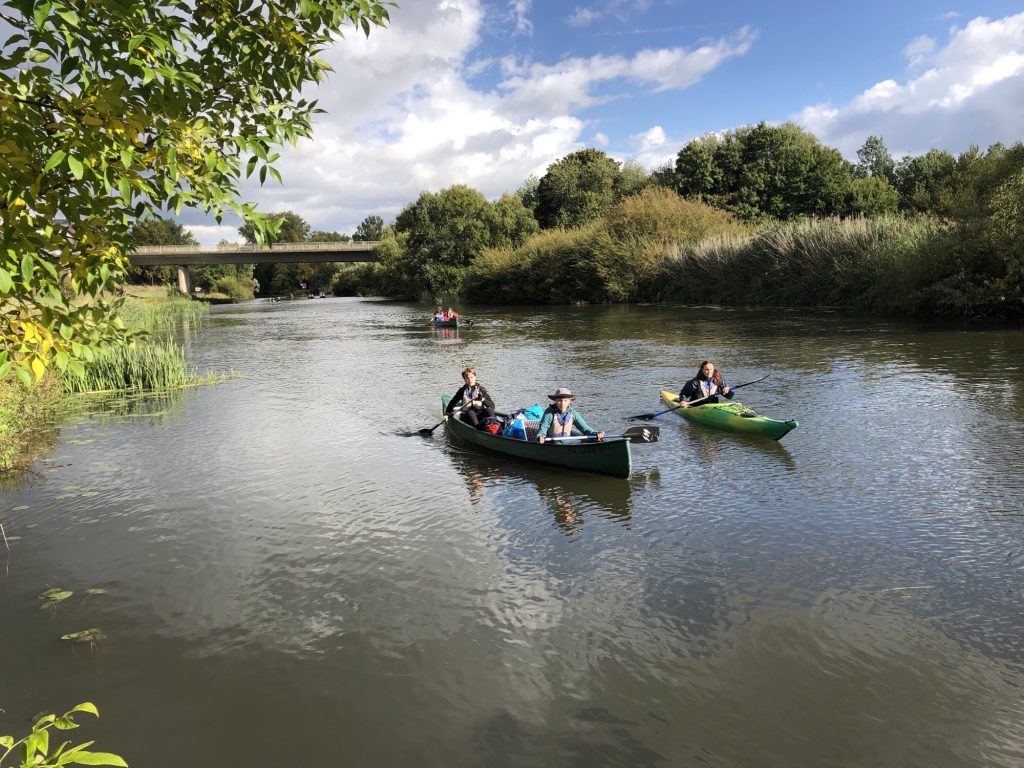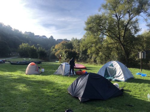 In der Nacht hat es aufgehört zu regnen. Dann: Zelte einpacken, frühstücken, lospaddeln. Die Strömung lässt nach, der Fluss wird breiter und wir erreichen Gießen. Dort gibt es drei Wehre mit Bootsrutschen – das ist fast wie im Freizeitpark, nur spannender, weil man umkippen könnte. Das passiert aber nicht – und so können wir bald die Strömung genießen, die uns durch die Natur treibt – inzwischen scheint auch wieder die Sonne. Heutiges Lernziel: wie bedient man eine Schleuse? Nach 3 Bootsrutschen, 2 Schleusen und 26 km erreichen wir Wetzlar und bauen unsere Zelte auf.