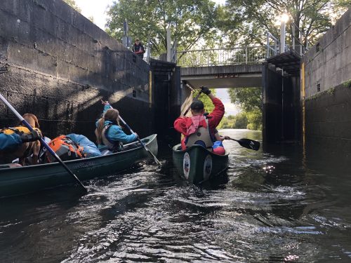 Heutiges Lernziel: Geschichte des Schifffahrtstunnels von Weilburg und Bedienung einer Koppelschleuse mit zwei Kammern. Bei bestem Wetter macht Kanufahren einfach nur Spaß und so erreichen wir nach dieser kurzen Etappe bald den Campingplatz Gräveneck, wo Zelte aufgebaut werden und tonnenweise Freieis geschleckt wird (Saisonende sei Dank). Und weil es so heiß ist, lassen es sich Einige von uns nicht nehmen, in der eiskalten Lahn zu baden.