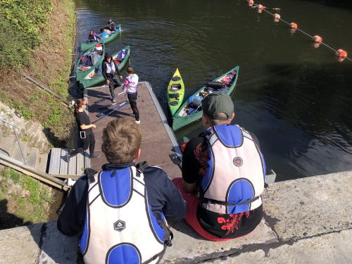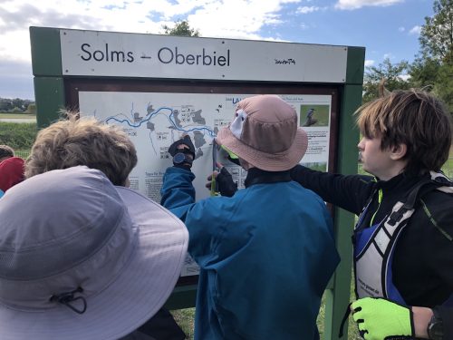 Tag 3: Inzwischen haben sich die idealen Bootsbesatzungen gefunden und die Steuerleute lassen die Kanadier fast geradeaus fahren. So erreichen wir bald die nächste Bootsgasse und dann die Rollenanlage am zweiten Wetzlarer Wehr. Danach folgen wir gemütlich dem mäandernden Fluss durch Wiesen und Wälder und drei weitere Schleusen – bis die Lahn plötzlich ihren Charakter ändert und zum schnell fließenden Gewässer wird. Stromschnelle an Stromschnelle lässt uns am Ufer vorbei-sausen: 11 km/h werden gemessen. Heutiges Lernziel: wie bremst man einen vollgeladenen Kana-dier in einer Kurve bei sehr starker Strömung mit einem U-Turn um einen Felsbrocken herum, um dahinter im Kehrwasser nicht den Campingplatz zu verpassen? Fünf von unseren 6 Booten haben das geschafft … das sechste haben wir aber auch wieder eingefangen.