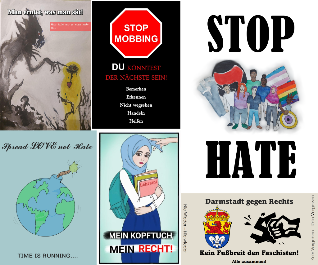 All diese Begriffe begegnen den SchülerInnen der GHS und uns in ihrer hässlichen Bandbreite im Alltag. Die sowohl zeichnerisch/malerisch als auch digital gestalteten Plakate des Grundkurses Kunst Q2 (Fr. Bova, SJ 2021-22) appellieren an uns alle, nicht wegzusehen und Haltung zu zeigen, egal ob im Schulalltag, bei Treffen im Freundeskreis oder in sozialen Netzwerken.