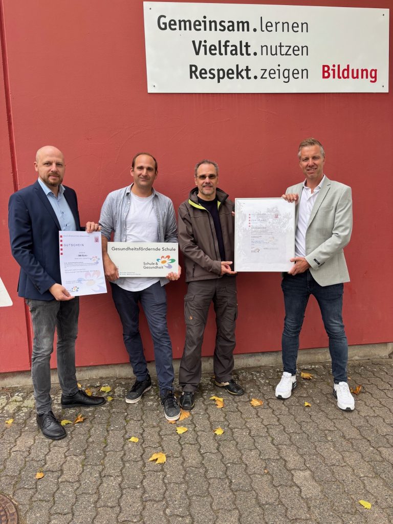 Stellvertretend für die Gesunde-Schule-AG und die gesamte Schulgemeinschaft nahmen Herr Chris Thalheimer und Herr Tobias Weiler die Auszeichnung stolz von Herrn Neufeld und Herrn Schröder entgegen.