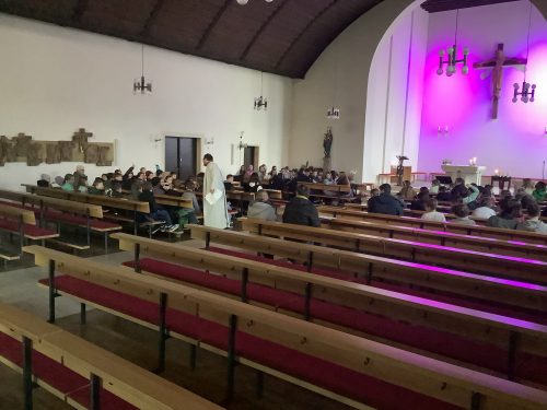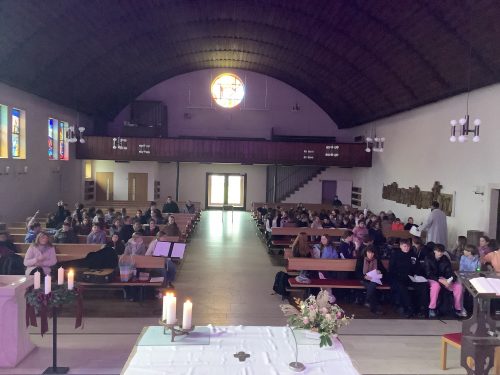 Nach der herzlichen Begrüßung durch Lehrkräfte und Gastgeber begann der Gottesdienst. In einem kurzen, aber sehr ansprechenden kleinen Theaterstück stellten die Schüler der evangelischen Religiosngruppe 7 von Frau Soeder das Thema „Freude bereiten“ auf verständliche und lebendige Weise dar. Anschließend folgte eine kurze Predigt durch Markus Kreuzberger zu dem Thema, bei dem die Schüler involviert wurden. Der ökumenische Gottesdienst war geprägt von einer großen Beteiligung aller Anwesenden – Schüler, Eltern und Lehrkräfte –, insbesondere beim gemeinsamen Singen und beim Vaterunser.