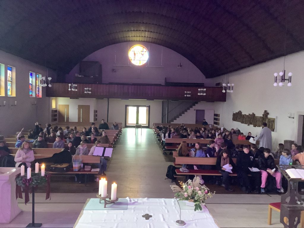 Am 5. Dezember 2025 war es endlich so weit: Die konfessionsbezogenen Lerngruppen der Jahrgangsstufe 5 der GHS – sowohl katholisch als auch evangelisch – konnten am ökumenischen Gottesdienst zum Schuljahresbeginn teilnehmen. Gemeinsam machten sich die Gruppen auf den Weg zur St.-Stephans-Kirche. Dort wurden sie von Markus Kreuzberger, Gemeindereferent der Pfarrei Heilig Kreuz, begrüßt.