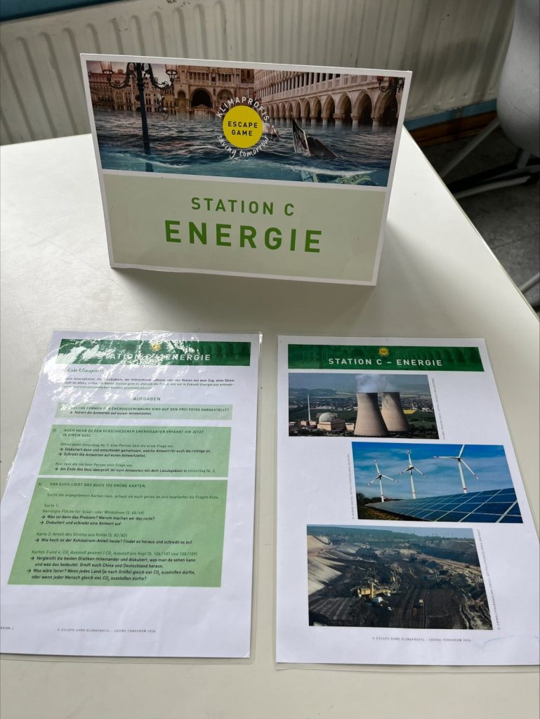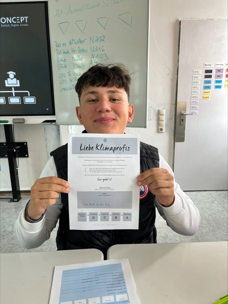 Passend dazu besuchten uns am 09.09.2025 Herr Mack und Herr Kändler vom Evangelischen Dekanat Darmstadt. Sie sind sogenannte ,,Referenten für Bildung und Gesellschaft‘‘ und führen verschiedenste Bildungsaktionen u.a. mit Schulen durch. Wir spielten an diesem Tag ein Escape Game, das den Titel „Klimaprofis: Saving tomorrow“ trug.