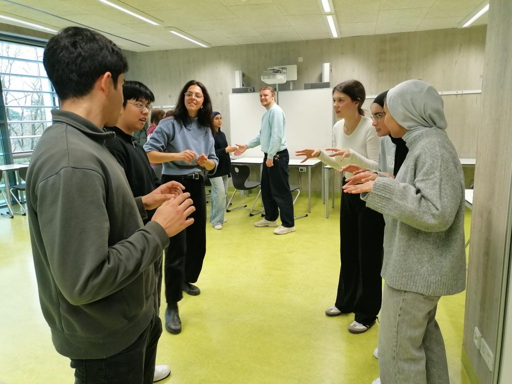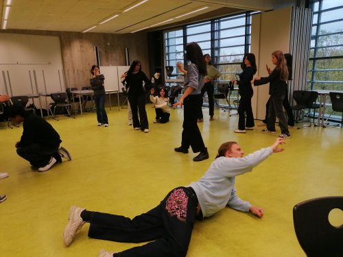 Nach intensivem und aktivierendem Aufwärmtraining wurde an beiden Tagen (8-14 Uhr) praktisch gearbeitet. Einzelne Szenen wurden zunächst in andere Kontexte übertragen, um dann die gesamte Handlung in ein neues Setting zu transformieren. Die Schülerinnen und Schüler waren mit Begeisterung und großem Engagement bei der Sache und führten zum Abschluss ihre Neuinterpretationen auf. Besonders beeindruckend war die Tatsache, dass nichts verschriftlicht worden war, es wurde frei gesprochen, alle gingen in ihren Rollen auf. Damit war eine sichere Grundlage für die weitere Bearbeitung der Tragödie im Unterricht geschaffen worden.