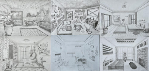 - “Zimmer in Zentralperspektive” – Bleistift auf Papier, G10b & R9h