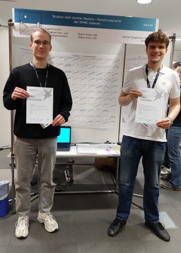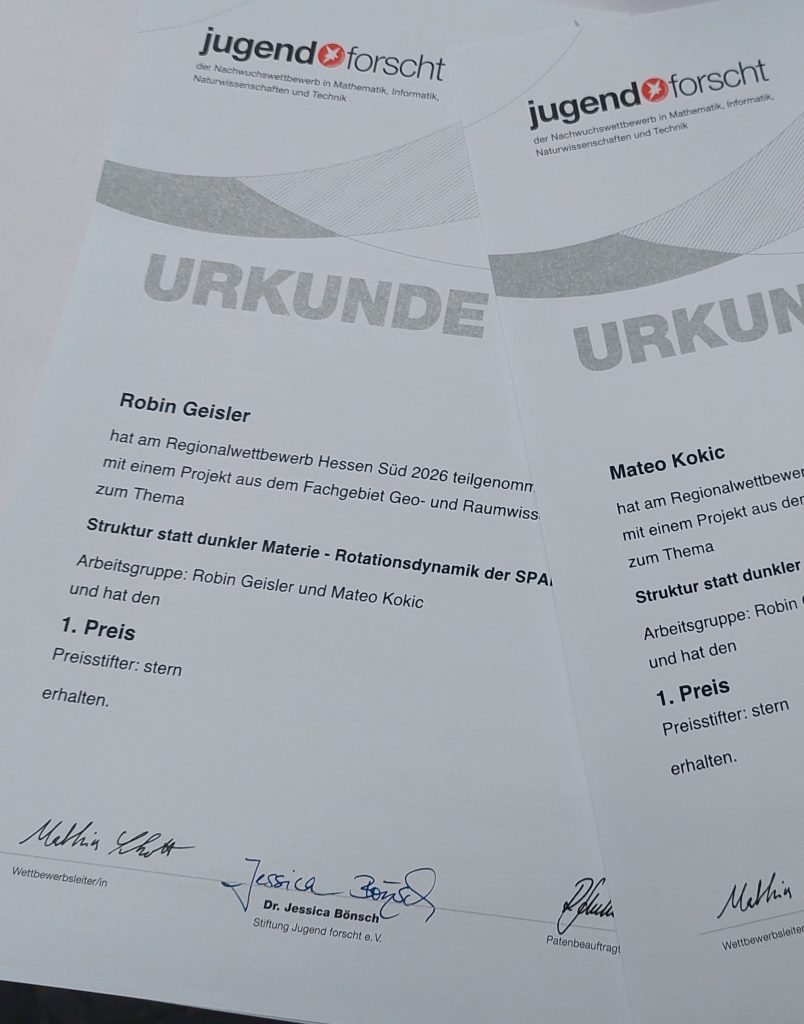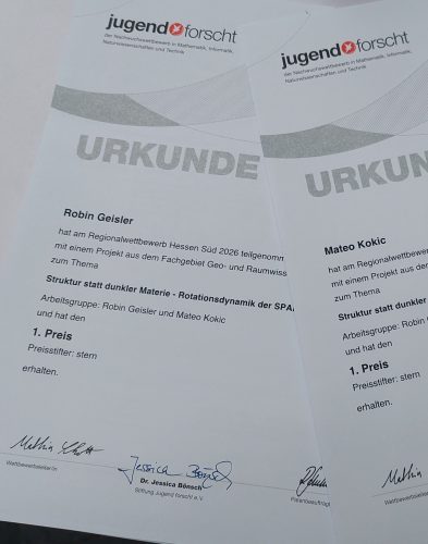Robin Geisler (Q4) und Mateo Kokic (Kl. 10) vom Mad Science-Club der GHS haben heute ihr Projekt über die Rotation von Galaxien vorgestellt, den ersten Preis bekommen und sind damit für den Landeswettbewerb qualifiziert. Galaxien – wie unsere Milchstraße – drehen sich. Die beobachtete Rotationsgeschwindigkeit ist allerdings zu schnell für die Gravitation und die Sterne müssten wegfliegen. Da sie das nicht tun, wurde angenommen, dass es im Universum riesige Mengen an dunkler Materie gibt, die wir mit keinem Messinstrument sehen können, die aber dafür sorgt, dass in den Galaxien mehr Masse vorhanden ist. Mehr Masse, mehr Gravitation. Trotz jahrzehnte langer intensiver Suche wurde nie dunkle Materie gefunden, obwohl auch unsere Milchstraße sich viel zu schnell dreht. Robin und Mateo haben an 175 präzise vermessenen Galaxien gezeigt, dass man die fehlende Gravitation auch durch einen kohärenten Effekt eines evaneszenten Gravitationsfeldes verstehen kann. Weil das jetzt wahrscheinlich niemandem etwas sagt, bemühen wir den Vergleich mit einem Magnetfeld: In einem magnetischen Material – ältere kennen vielleicht noch Video- oder Audiokassetten – gibt es sogenannte Weißsche Bezirke, die durch Magnetfelder kohärent ausgerichtet werden. Wenn die Bereiche in die gleiche Richtung orientiert sind, verstärkt sich das Magnetfeld. So ähnlich stellen sich Robin und Mateo das Gravitationsfeld vor … und schon klappt es mit der Gravitation und der Rotationsgeschwindigkeit. Das Projekt wurde von Dr. Dlabal betreut.
