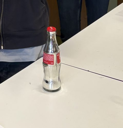 Mit viel Sorgfalt wurden die Cola-Flaschen zunächst vorbereitet/leergetrunken und anschließend chemisch beschichtet, sodass sich im Inneren eine glänzende Silberschicht bildete. Das Ergebnis konnte sich sehen lassen: aus einfachen Cola-Flaschen entstanden dekorative, spiegelnde Objekte – passend zur vorweihnachtlichen Zeit.