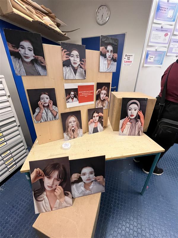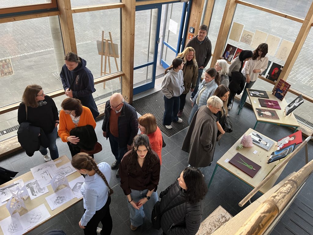 Der Leistungskurs Kunst (Q4) unter Leitung von Fr. Bova zeigte im F-Block eine Ausstellung praktischer Arbeiten (Malerei, Fotografie, Zeichnung & Projektdokumentationen), die im Verlauf der Halbjahre Q1 bis Q4 entstanden sind. Die Werke zeigten eindrucksvoll die kreative Entwicklung der Schülerinnen und luden zum Entdecken und Austausch ein. Ein besonderer Programmpunkt des Abends war die Performance des Grundkurses Darstellendes Spiel (Q4), die unter Leitung von Fr. Silke Neumann in Kooperation mit Nadja Soukup des Theaterlabor Inc. aus Darmstadt entwickelt wurde. Unter dem Titel „Die Weber 2.0 – Spiel des Überlebens“ zeigten die PerformerInnen eine moderne Interpretation, die das Publikum mit ihrer Intensität und Aktualität in den Bann zog.